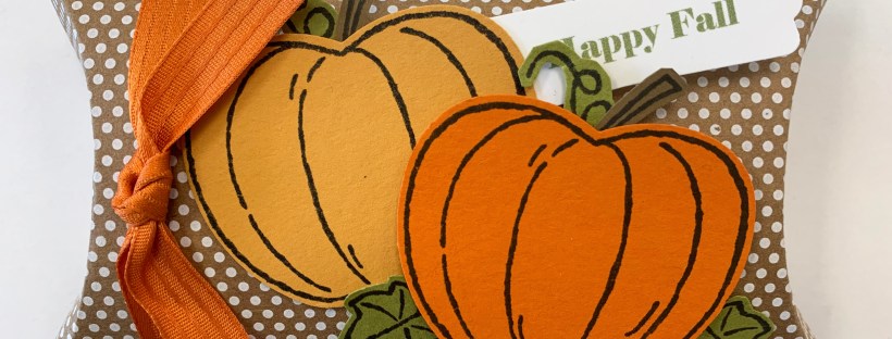 I affixed the pumpkins to the Kraft Pillow Boxes using Stampin’ Dimensionals and printed “Happy Fall” on Whisper White Cardstock using my computer and printer.