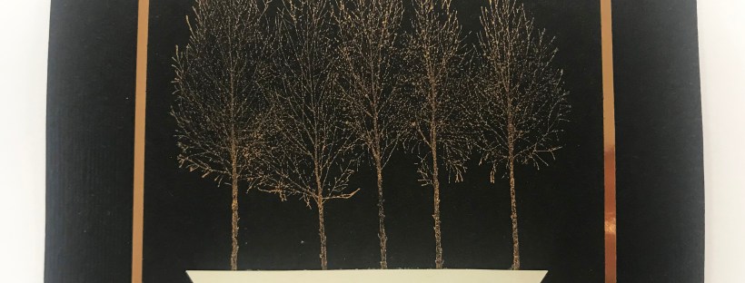 Cut Copper Foil Sheet 4” x 3.25” and black carstock 3.75” x 3”. Stamp the tree image from Winter Woods in Copper Ink and voila, its beautiful and looks like its embossed!! It dries so quickly and doesn’t smear at all!!