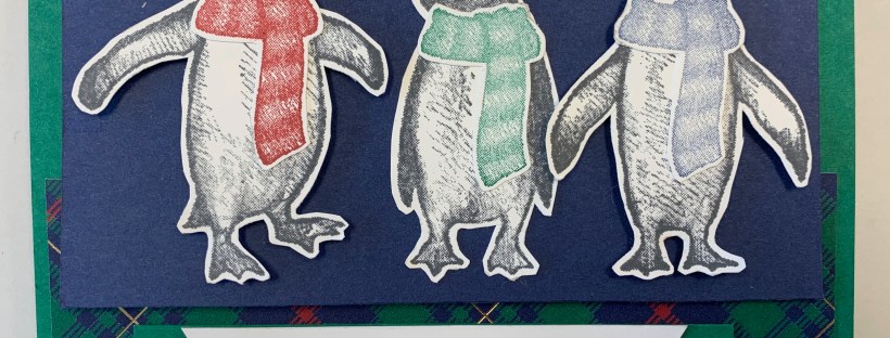 This week I am featuring the Playful Penguins Cling Stamp Set. This cute card gives some festive flair when accompanied with the Wrapped in Plaid DSP!