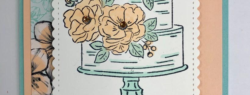 Next, stamp the pretty two-tier cake stamp on a piece of Whisper White 8-1/2″ X 11″ Cardstock using Tuxedo Black Memento Inkpad. I colored in the cake lines using a Pool Party Light Stampin’ Blends Marker and the flowers with a Petal Pink Light Stampin’ Blends Marker. You can shade the flowers with the Petal Pink Dark Stampin Blends Marker. The leaves are colored with Light Mint Macaron Stampin Blends Marker. I cut the cake out using one of the pretty scallop squares from Stitched So Sweetly Dies. Then embellish the flowers with Champagne Rhinestones and it makes for a stunning cake.