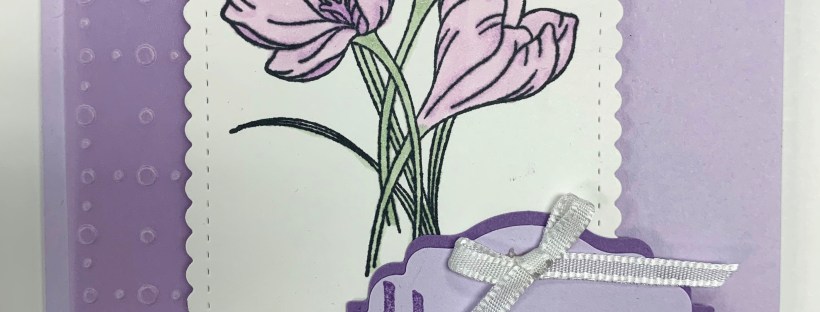 I stamped the beautiful bouquet of flowers from the Easter Promise Cling Stamp Set using Memento Ink. I colored my bouquet using my Purple Posy Stampin’ Blends Combo Pack and my Dark Soft Sea Foam Stampin’ Blend. Use light Purple Posy for the petals and add a touch of your Dark Purple Posy Stampin Blends to the center of the flowers. I cut out the bouquet with one of my Stitched So Sweetly Dies.