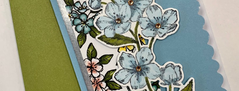 For this card, I used my Seaside Spray Stampin’ Blends Combo Pack to color in this pretty blossoms stamp from the Forever Blossoms Cling Stamp Set. I used a Light Old Olive Stampin’ Blend for the leaves of the blossoms. Then, I embellished the center of the flowers with a few Champagne Rhinestones. Make sure to use Black Memento Ink when coloring with your Stampin’ Blends!