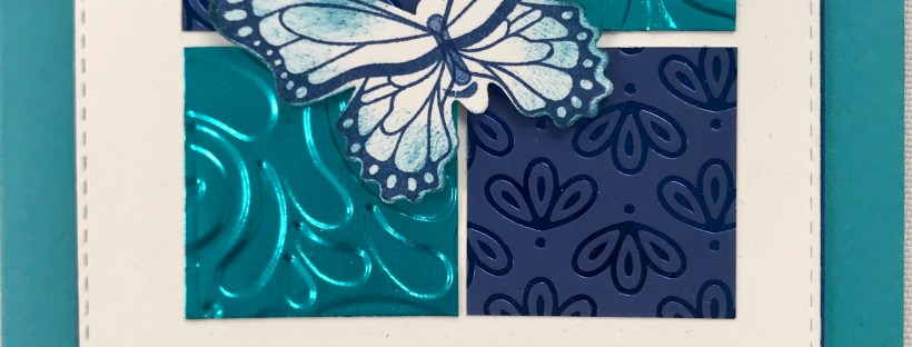 I adhered the Whisper White rectangle to the Blueberry Bushel rectangle. I cut the squares for above the greeting out of Blueberry Bushel Noble Peacock Specialty DSP (and Bermuda Bay Noble Peacock Foil Sheets ran through with the Swirls and Curls Embossing Folder. The squares are cut with my 1 1/4″ x 1 1/4″ punch–the punch is retired, but you could also cut your paper to that size if you don’t have it!