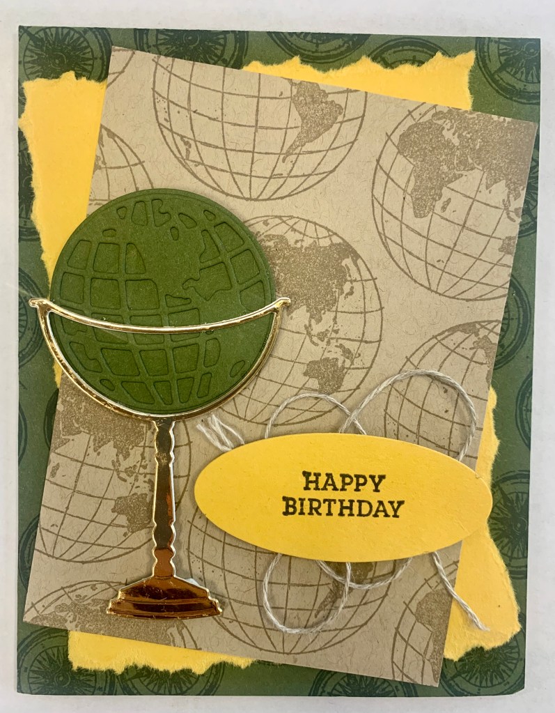 I used the World Map Dies to cut out a globe in Mossy Meadow Cardstock. I used a small piece of Gold Foil Sheets for the globe stand.