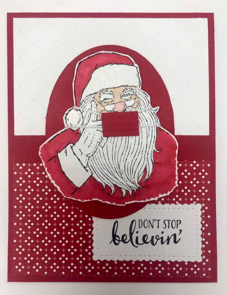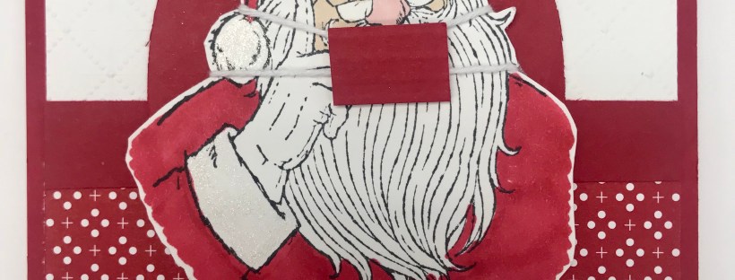 Next, I stamped Santa in Black Memento Ink. I used my Real Red, Ivory, & Petal Pink Stampin’ Blends. I embellished Santa’s hat & trim with my Wink of Stella Clear Glitter Brush.