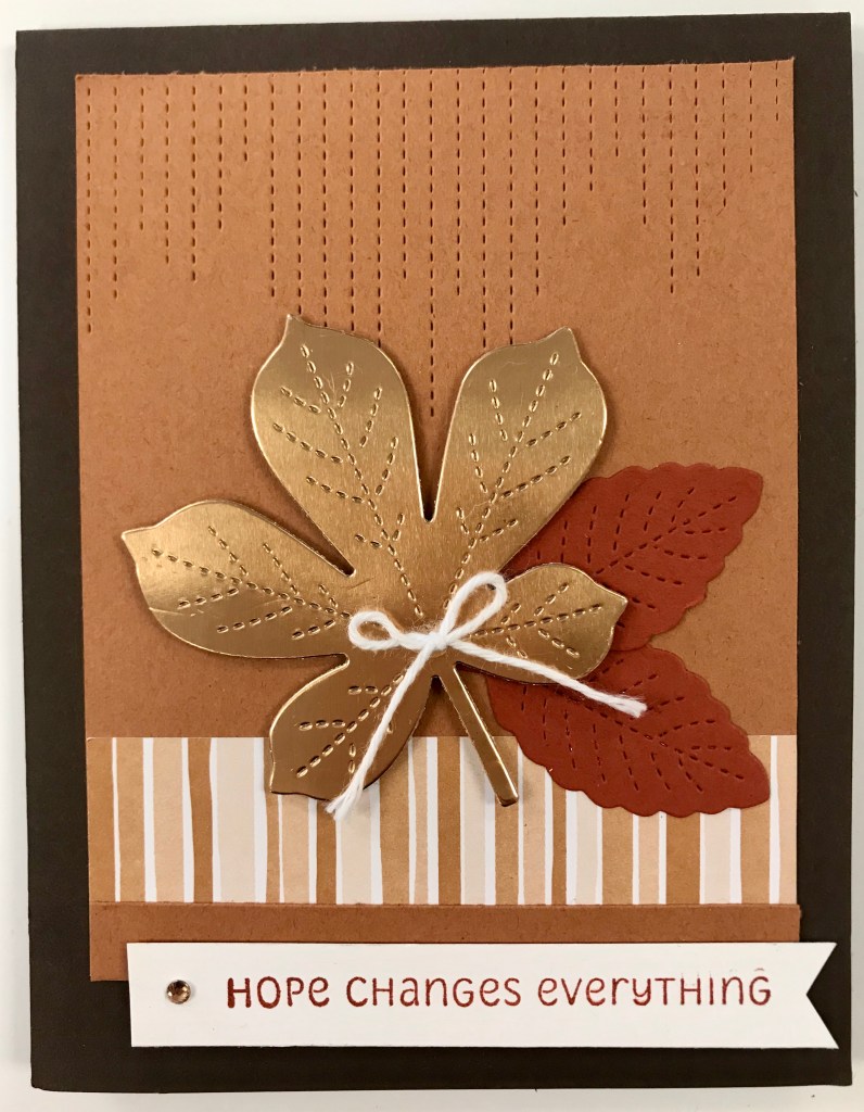 Next, I stamped the “Hope changes everything” greeting from the Love of Leaves Bundle on Whisper White Cardstock in Cinnamon Cider Ink.