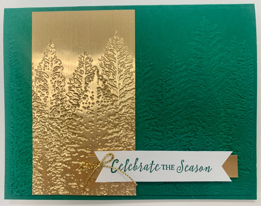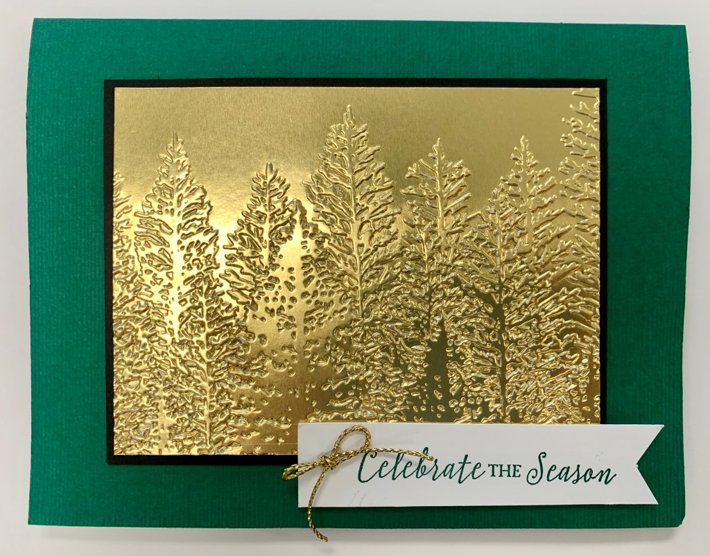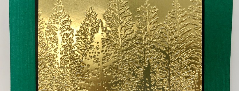 I cut a 4″ x 3″ piece of Gold Foil Sheets and embossed it with the Evergreen Tree Embossing Folder. Then, I matted the Gold Foil on a piece of Basic Black Cardstock.