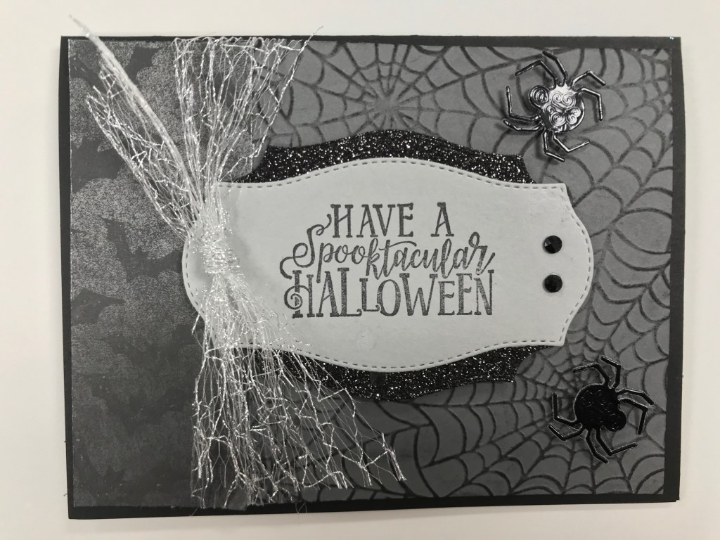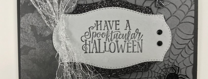 I stamped the “Have a Spooktacular Halloween” greeting from the Spooktacular Bash Stamp Set in Basic Black ink on silver paper. I cut out the greeting with my Tasteful Label Die. I cut out some Black Glimmer paper behind the greeting.