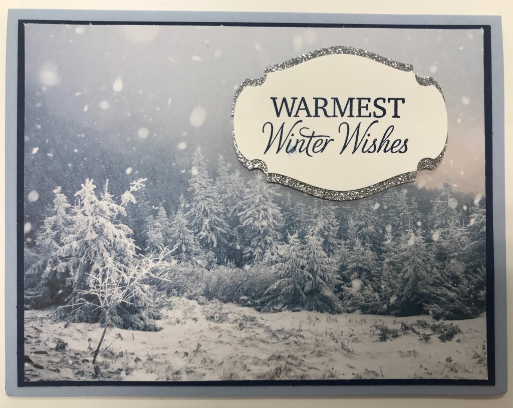 TIP: Use Tear & Tape Adhesive to adhere greeting to glitter paper. Regular adhesive is not strong enough. The silver glitter helps to bring out the sparkling snow in the DSP!