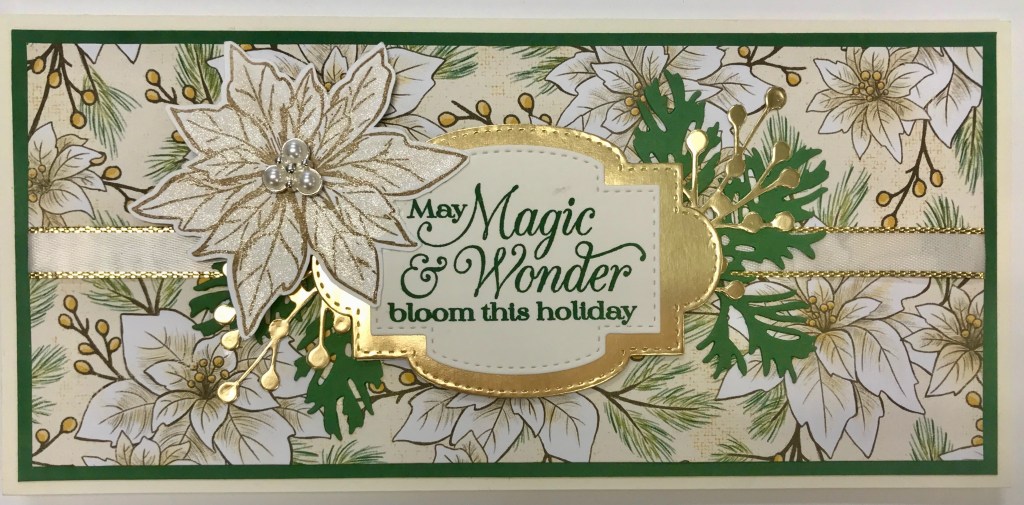 I used the pine needle dies from the Beautiful Boughs Dies (cut from Garden Green Cardstock) and the buds from the Poinsettia Petals Bundle (cut from Gold Foil Sheets) for the embellishments behind the greeting.