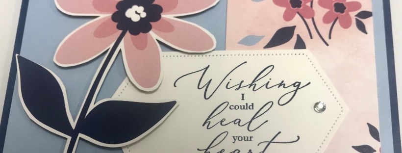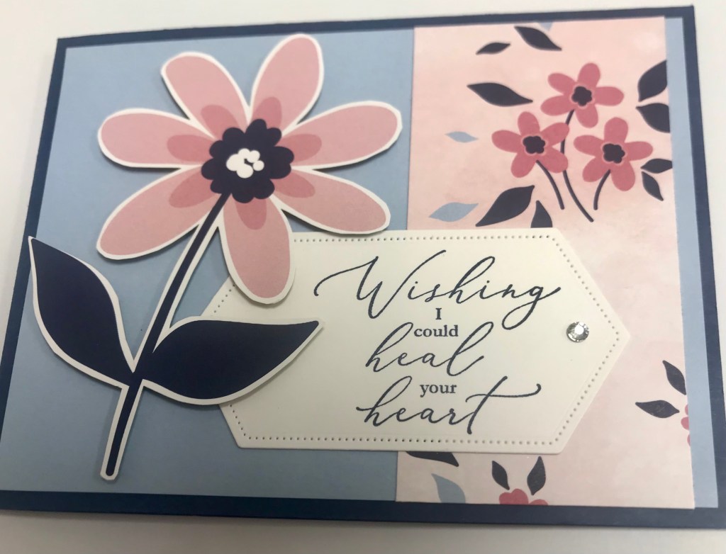 Next, I stamped the greeting from Heal Your Heart Cling Stamp Set in Night of Navy Ink on Whisper White Cardstock. I cut the greeting out so it was on the left with one of my Stitched Nested Label Dies. I embellished the greeting with a rhinestone.