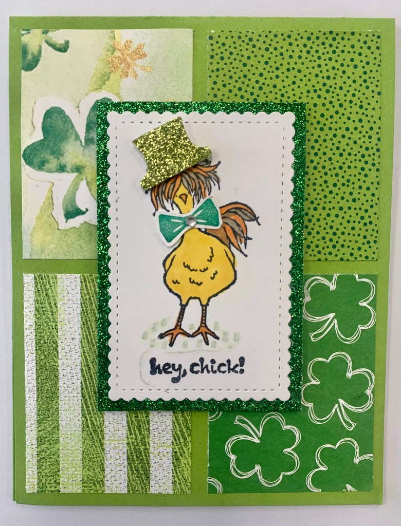 I stamped a Happy St. Patrick’s Day greeting in Call Me Clover on the inside of the card! Check out my Hey Chick St. Patrick’s Day Card Supply List!