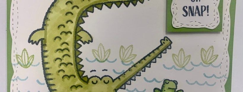 Next, I used the Oh, Snap stamp set and stamped the alligator in Black Momento Ink on a piece of Whisper White cardstock. I used Balmy Blue ink to stamp the waves behind the alligator and Granny Apple Green for the lily pads on top of the water.