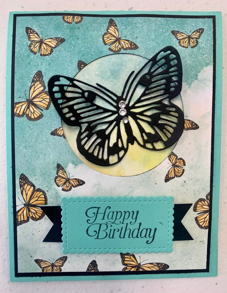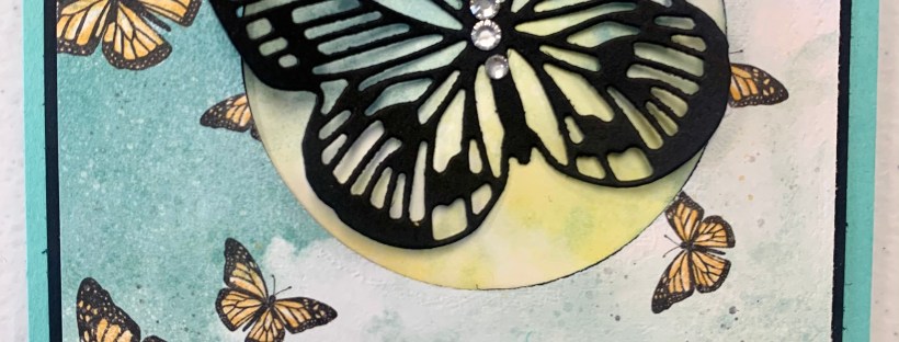 I cut the largest butterfly from Basic Black Cardstock with my Brilliant Wings Dies and adhered it to the center of the 2″ circle. I embellished the butterfly with some Rhinestones.