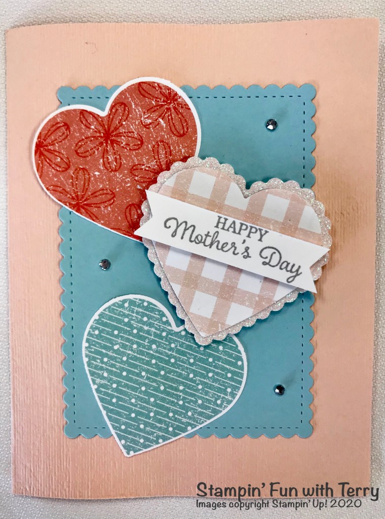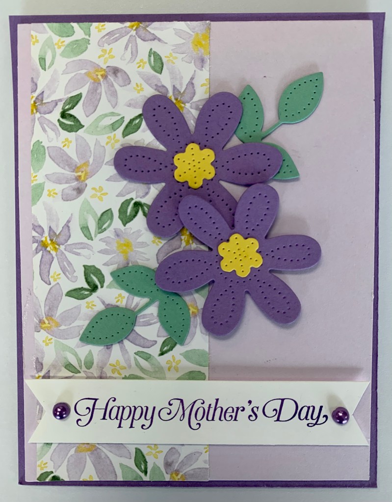 Finally, I stamped the “Happy Mother’s Day” greeting in Highland Heather on Whisper White Cardstock. Finally, I embellished with a couple Pastel Pearls.
