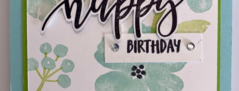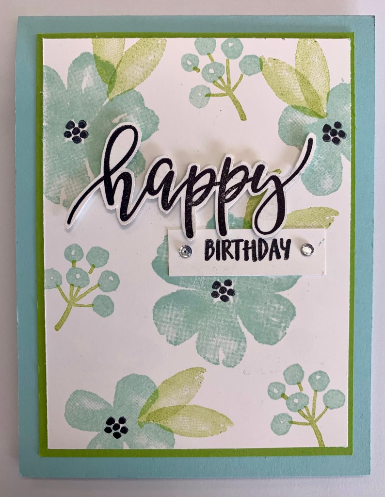 Finally, I stamped the “happy” and “BIRTHDAY” greetings in black ink on Whisper White Cardstock. I fussy cut the “happy” and adhered it over the “BIRTHDAY” which I cut out into a rectangle. I embellished the “BIRTHDAY” with a couple rhinestones to add some sparkle!