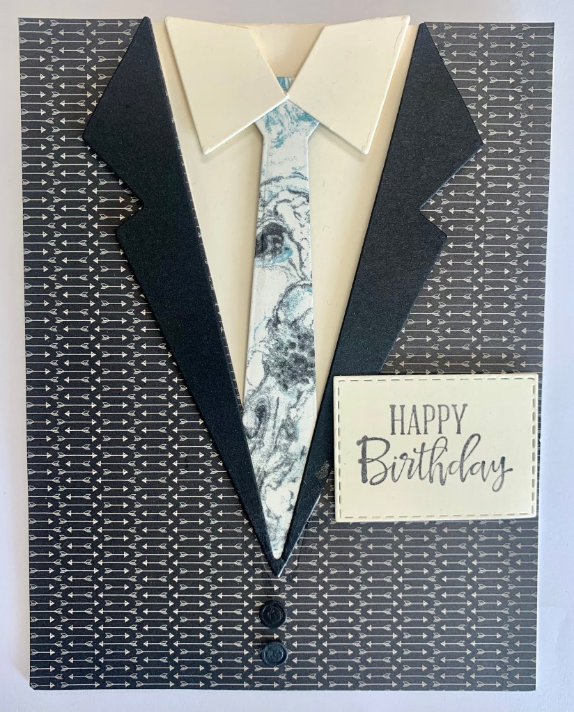 I cut out the edge of the jacket with my Tie Dies and adhered some lapels cut from Basic Black Cardstock.