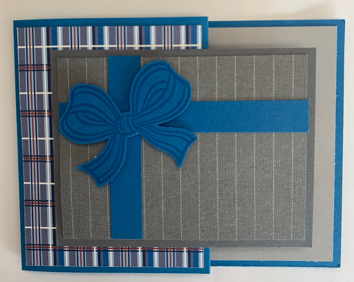 I cut a rectangle for the gift on the top of the card and used the bow from the Gift Wrapped Bundle for the present’s bow. I stamped the bow in Pacific Point ink on Pacific Point Cardstock and cut it out with the punch from the bundle.