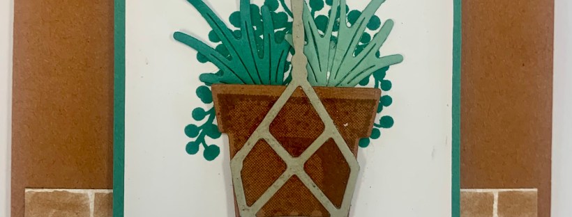 I used the Plentiful Plants dies to cut out a hanging basket from a piece of Sahara Sand and various plants in different shades of green to put in the terra-cotta pot.