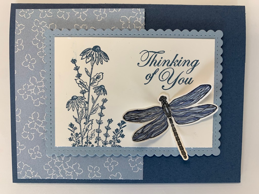 I stamped the dragonfly from the Dragonfly Garden Bundle in Black Memento Ink, punched out with the Dragonfly Punch. I love the ease of punches!! Then I colored in the wings with my Misty Moonlight Stampin’ Blends Combo Pack.