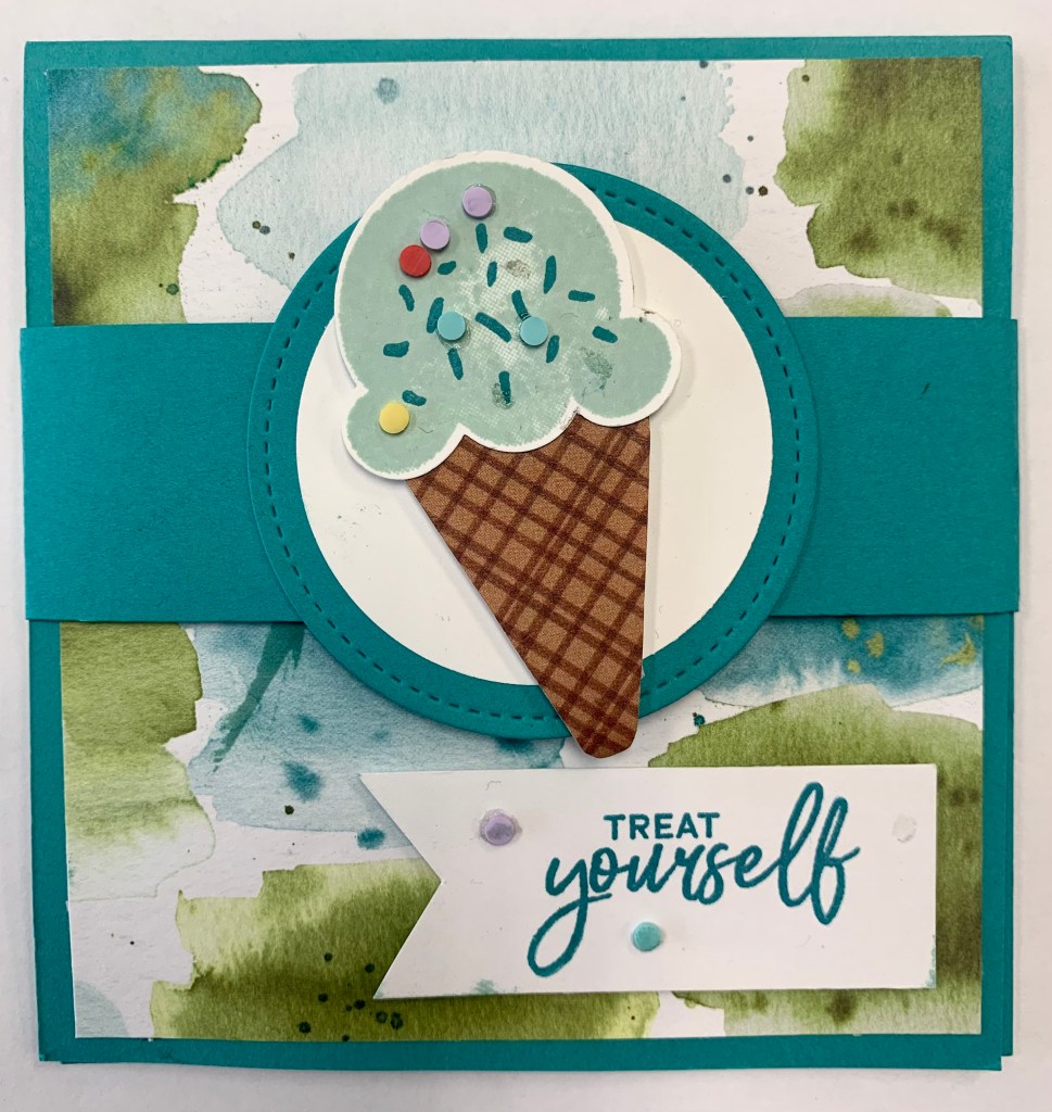 I cut a 4″ x 4.25″ piece of Ice Cream Corner DSP and adhered it to the front of the card.