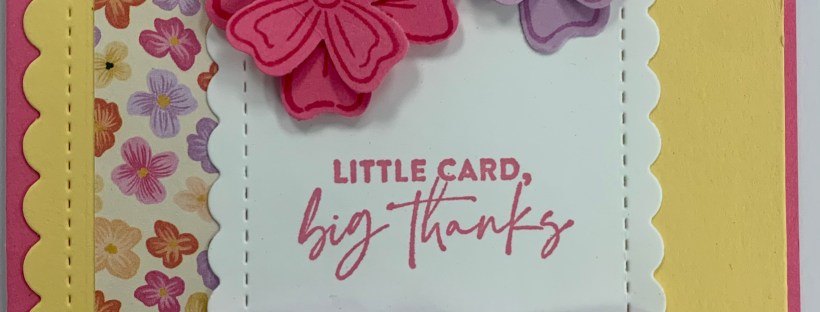 Next, I stamped the “Little card, big thanks” greeting in Polished Pink on Whisper White cardstock and cut it out with my Scalloped Contour Die.