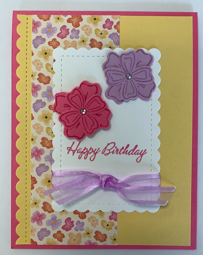I cut a 2″ x 5.25″ piece of Pansy Petals DSP on the card.