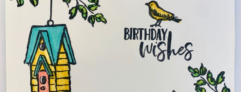 Next, I stamped the birdhouse hanging off the top branch in Black Memento Ink. I used Coastal Cabana Stampin Write for the roof, Daffodil Delight Stampin’ Blends for the house, and my Flirty Flamingo Stampin’ Blend for the birdhouse door!