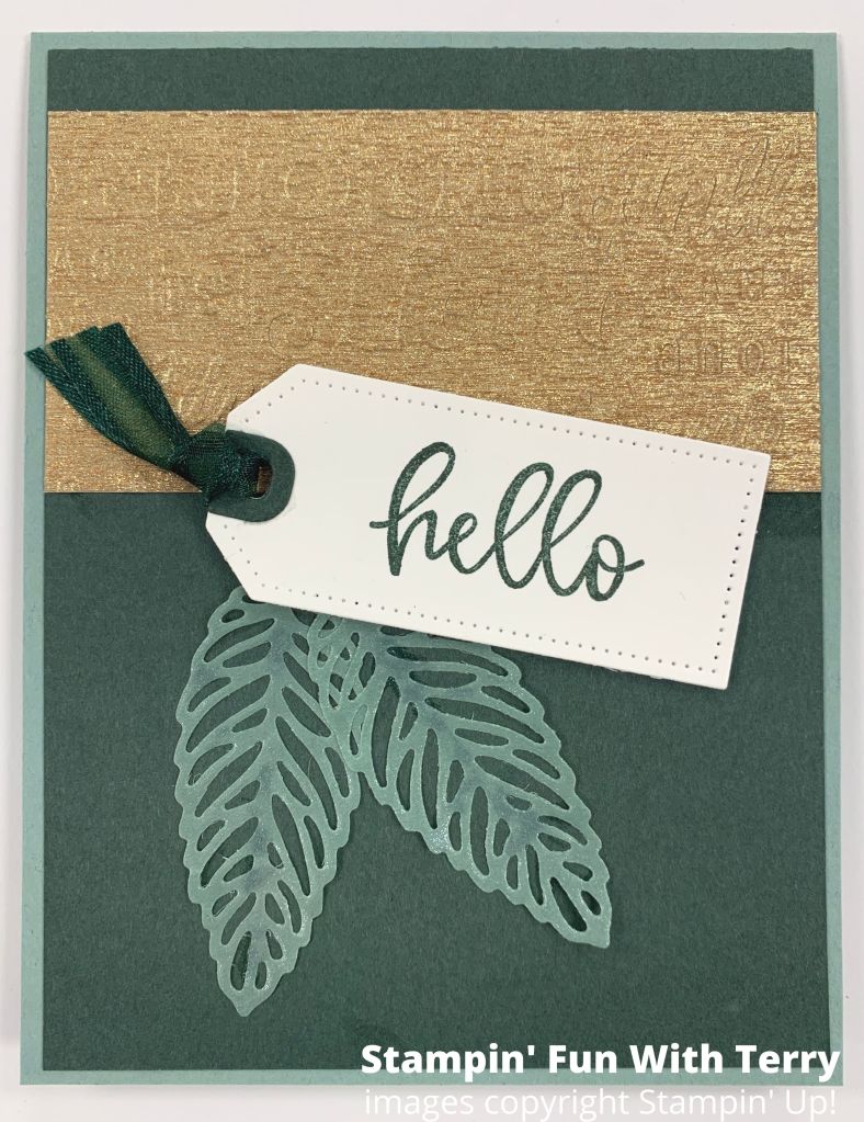 Next I embossed a 4″ x 2″ piece of Gold Metallic Specialty Paper with the Hello Embossing folder (from the Thanks & Hello Embossing Folder).