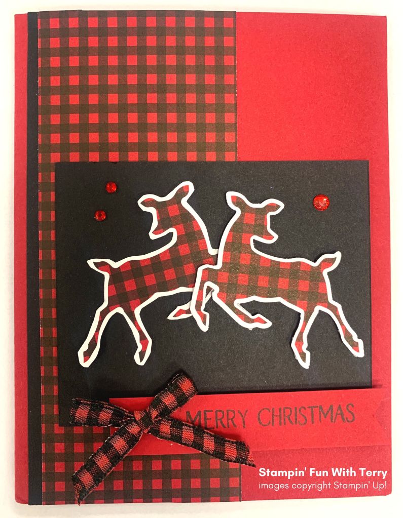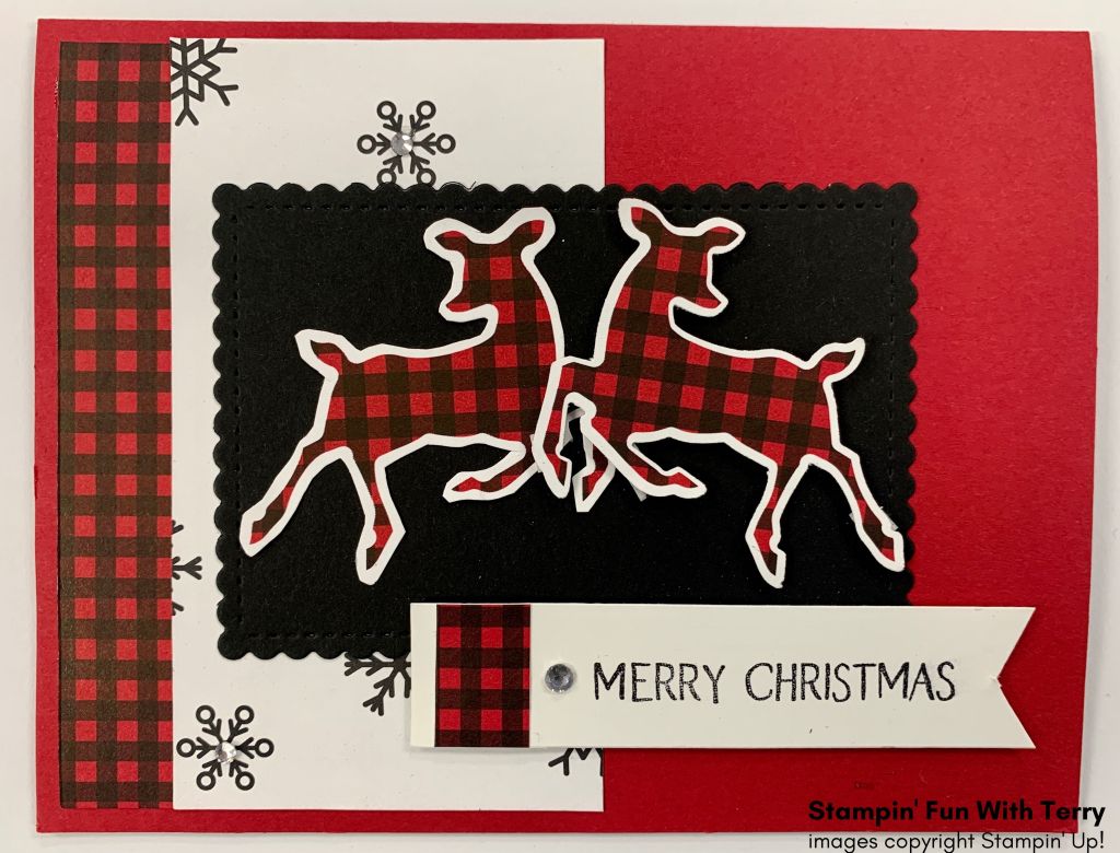 Finally, I stamped the “Merry Christmas” greeting from the Peaceful Deer Bundle in black ink on Whisper White Cardstock. I added a strip of gingham DSP from the Peaceful Prints DSP pack to the greeting with a Rhinestone.