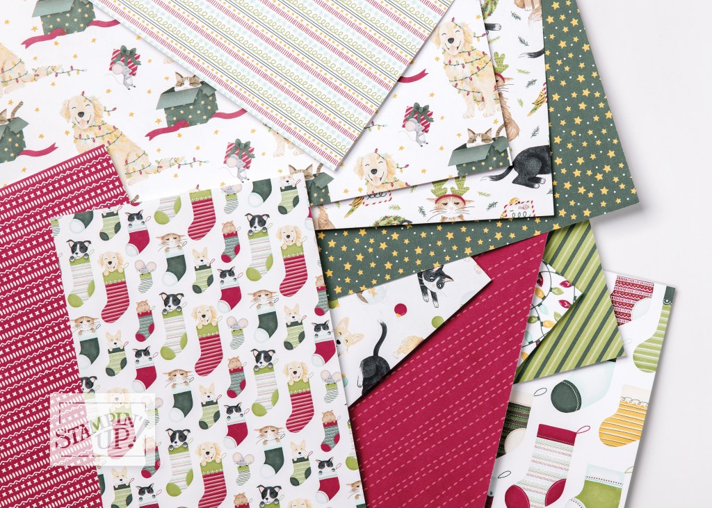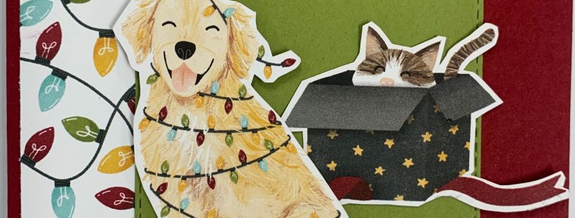Next, I used my Stitched Rectangle Die to cut out a piece of Old Olive cardstock. I stamped the greeting “Santa Paws is coming to town!” stamp from the Sweet Little Stockings Stamp Set in Cherry Cobbler ink.