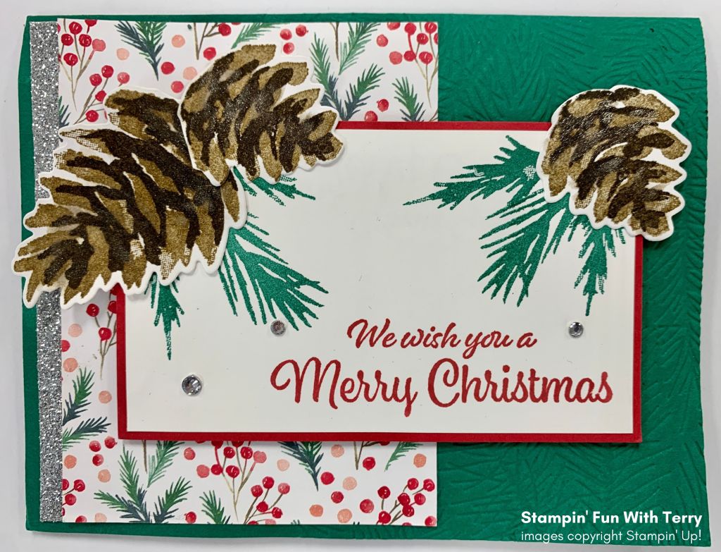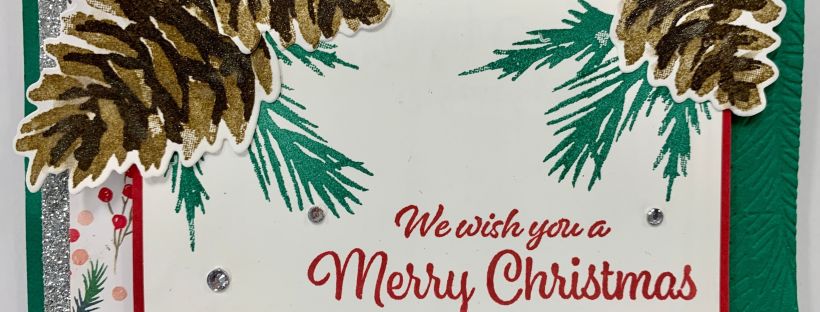 Next, I stamped the pinecones from the I stamped a 4″ x 2-3/8″ piece of Whisper White Cardstock with the evergreen stamps from the Christmas Season Bundle on Whisper White Cardstock in Soft Suede Ink & Early Espresso Ink. I cut them out with the dies from the Christmas Season Bundle. I embellished the pinecones with a bit of Wink of Stella.