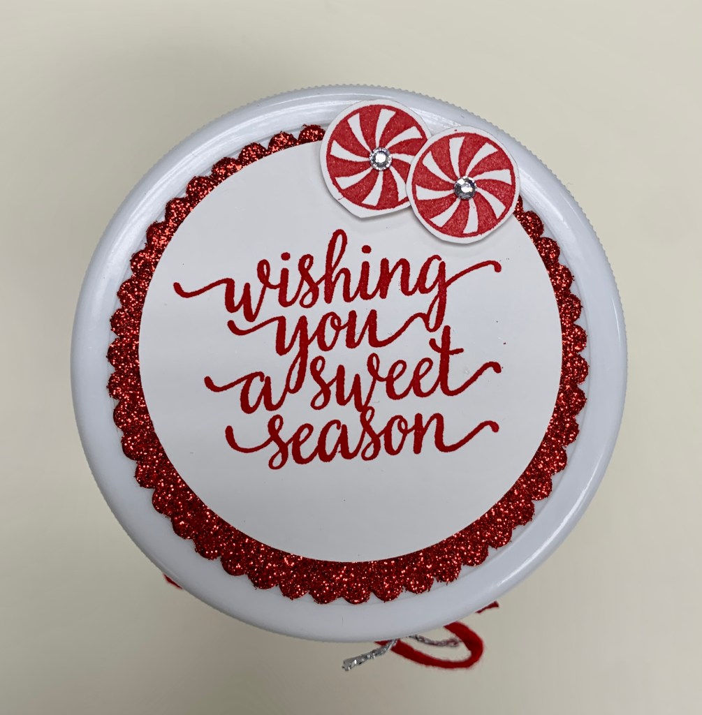 For the top of the jar, I used my Stampin’ Seal to adhere cardstock to the card. Stamp your holiday greeting on Whisper White Cardstock in a coordinating, festive color (I used Real Red with this DSP).
