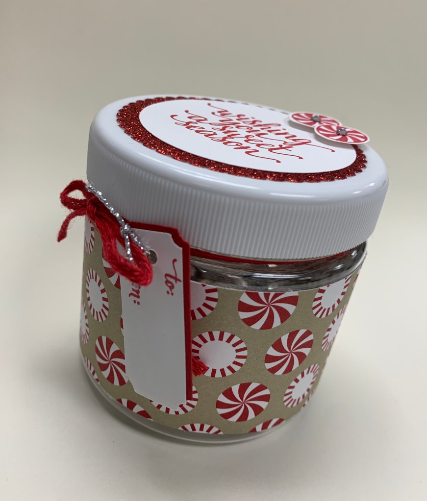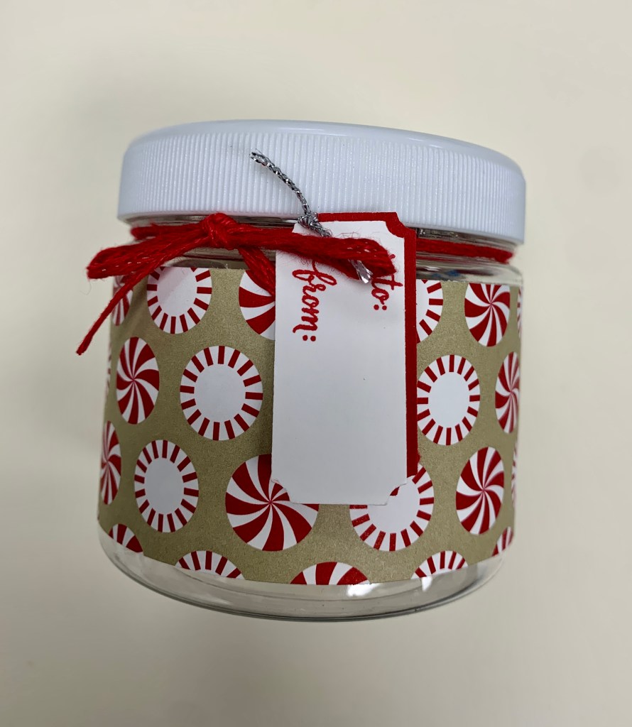 I used the retired Candy Cane Christmas Bundle for these specific jars, but use whatever festive paper you have and feel free to be creative making these cute jars! The current Gingerbread & Peppermint DSP would create a similar look!