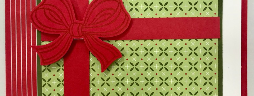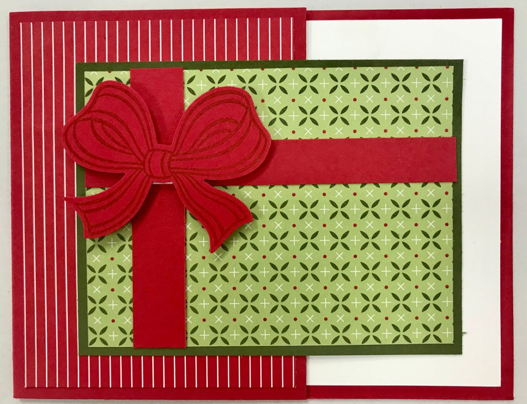 I cut a 4″ x 3″ rectangle for the gift on the top of the card and used the bow from the Gift Wrapped Bundle for the present’s bow. I stamped the bow in Real Red ink on Real Red cardstock and cut it out with the punch from the bundle.