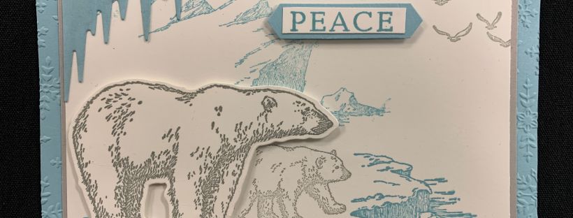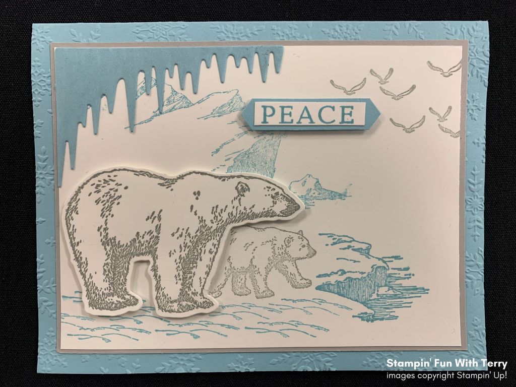 For the pretty winter scene, the glaciers & background are stamped from the Arctic Bears Bundle in Balmy Blue Ink on a piece of 4.5″ x 3.25″ Whisper White Cardstock. I stamped the baby polar bear in Smoky Slate and stamped the birds from the Peaceful Cabin Bundle in Smoky Slate as well.