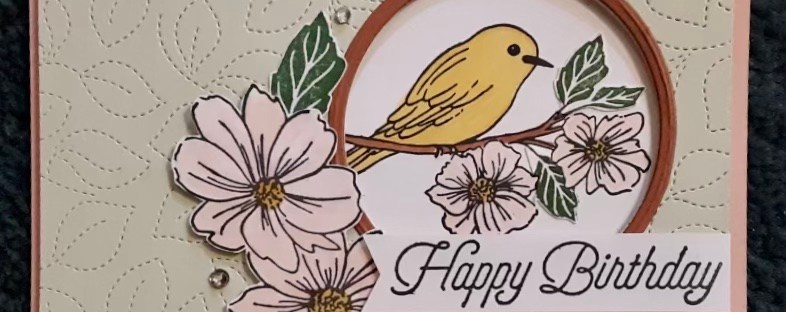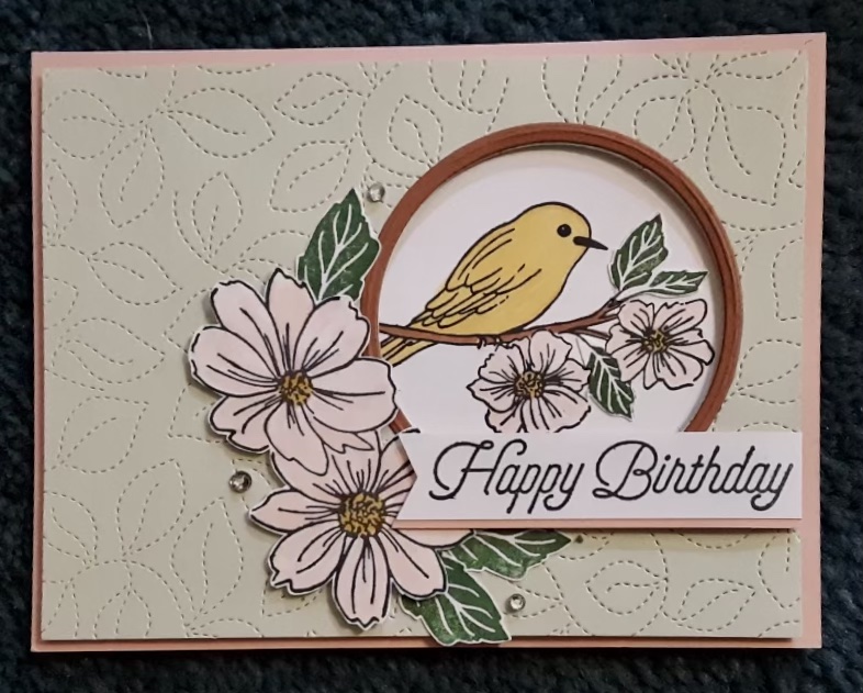 On a piece of Whisper White Cardstock, I stamped the bird from the Friendly Hello Bundle in Black Memento Ink and colored it with Daffodil Delight, Petal Pink, and Cinnamon Cider. I stamped the leaves from the stamp set in Garden Green Ink.