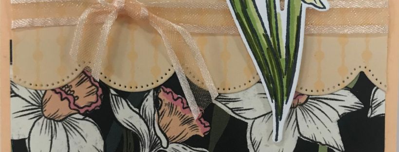 Finally, I stamped the daffodil from the Daffodil Daydream Bundle on Whisper White Cardstock in Black Memento Ink. I used Old Olive and Granny Apple Green Stampin’ Blends Markers for the stem and leaves; Pale Papaya and Flirty Flamingo Stampin’ Blends for the center of the flower; and Daffodil Delight Stampin’ Blends for the petals. I adhered the flower to the card with Dimensionals!