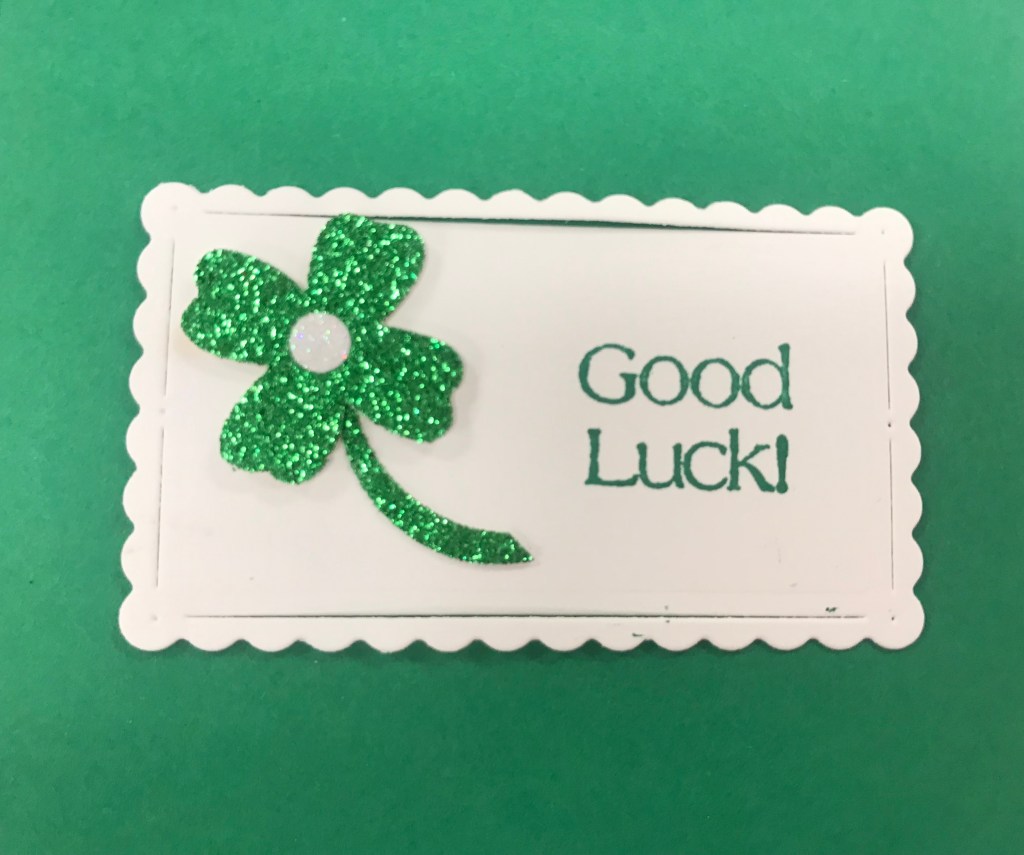 I stamped the greeting in Shaded Spruce Ink on Whisper White Cardstock and cut it out with my Scalloped Contours Die. I embellished with a “shamrock” punched from scraps of Green Glimmer Paper using my punch from the Flowers of Friendship Bundle. I embellished with a center made from a scrap of White Glimmer Paper.