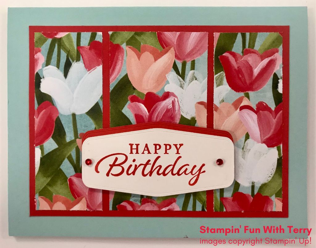I stamped the birthday greeting in Poppy Parade Ink on Whisper White Cardstock. I cut out the greeting with one of my Tasteful Label Dies. I cut out an additional piece of Poppy Parade Cardstock with my Tasteful Label Die and matted the greeting on top. I used the Happy Thoughts birthday greeting from last year’s Spring Mini Catalog.