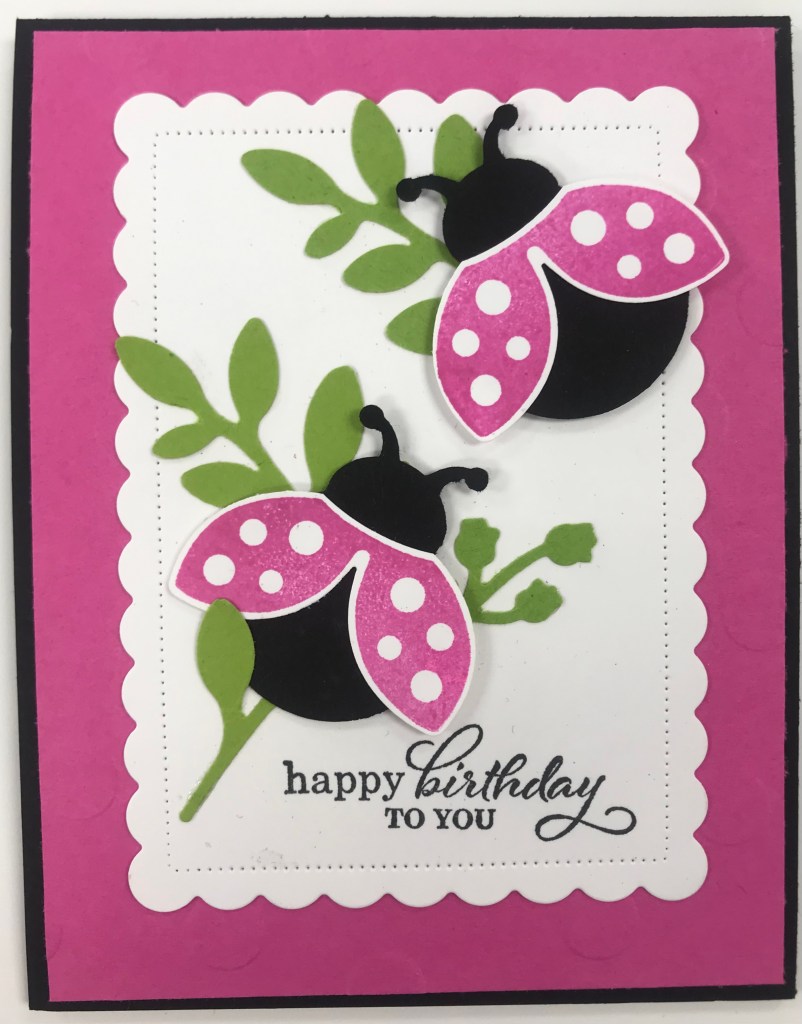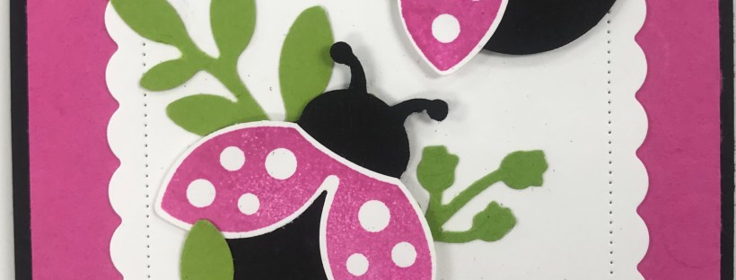 I stamped the wings from the Hello Ladybug Bundle in Magenta Madness Ink and cut them out with the Ladybug Builder Punch. I punched out the ladybugs from Basic Black Cardstock with the punch. I adhered the ladybugs to the card with Dimensionals.
