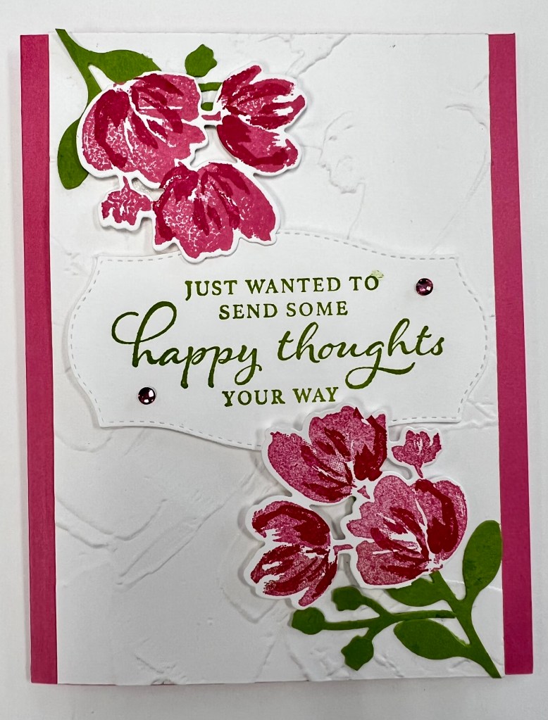 I stamped the flowers from the Art Gallery Bundle in Melon Mambo and Magenta Madness on Whisper White Cardstock. I used the corresponding die to cut it out. I adhered the flowers over the greenery with dimensionals.