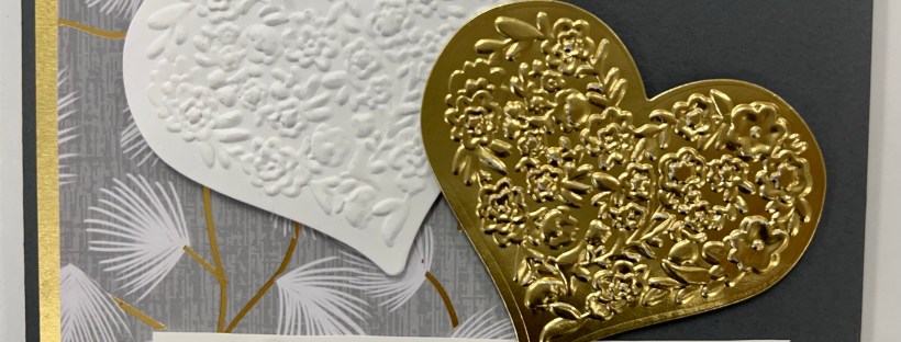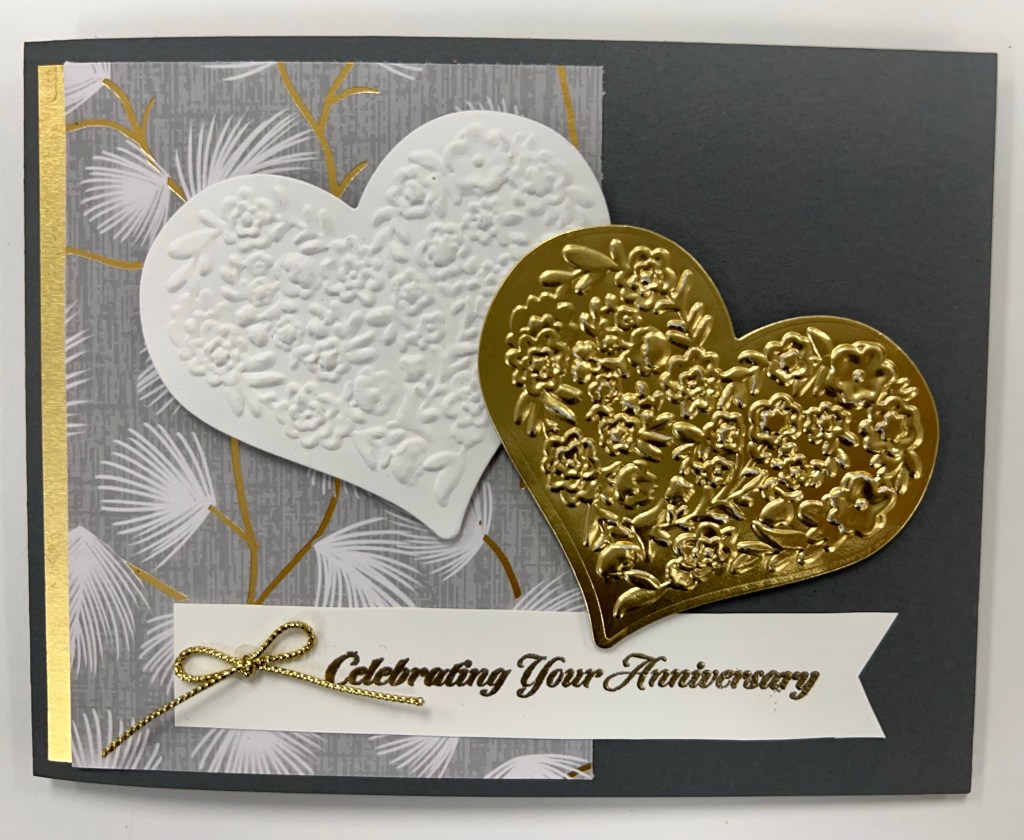 I used the Bouquet of Love Hybrid Embossing folder to cut the hearts from Whisper White and Gold Glimmer paper. I adhered them to overlap slightly with dimensionals.