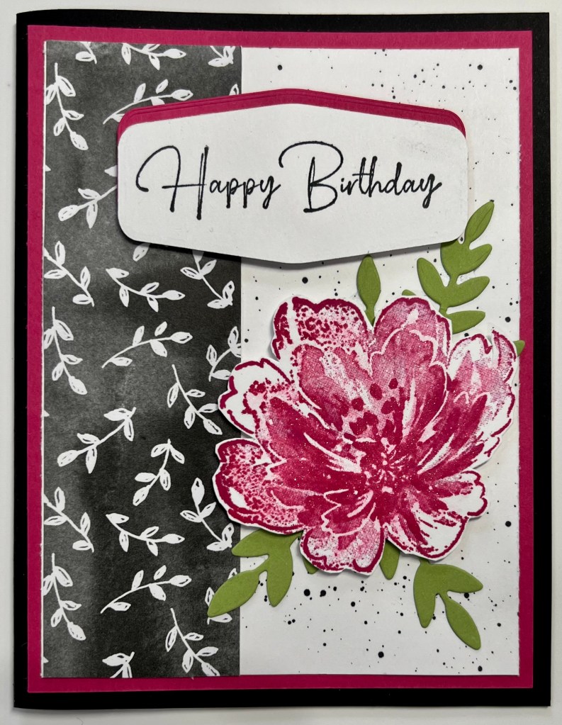 I stamped the “Happy Birthday” greeting in black ink on Whisper White Cardstock. I cut it out with my Tasteful Label Die and cut a second tag out from Melon Mambo Cardstock to mat the greeting!