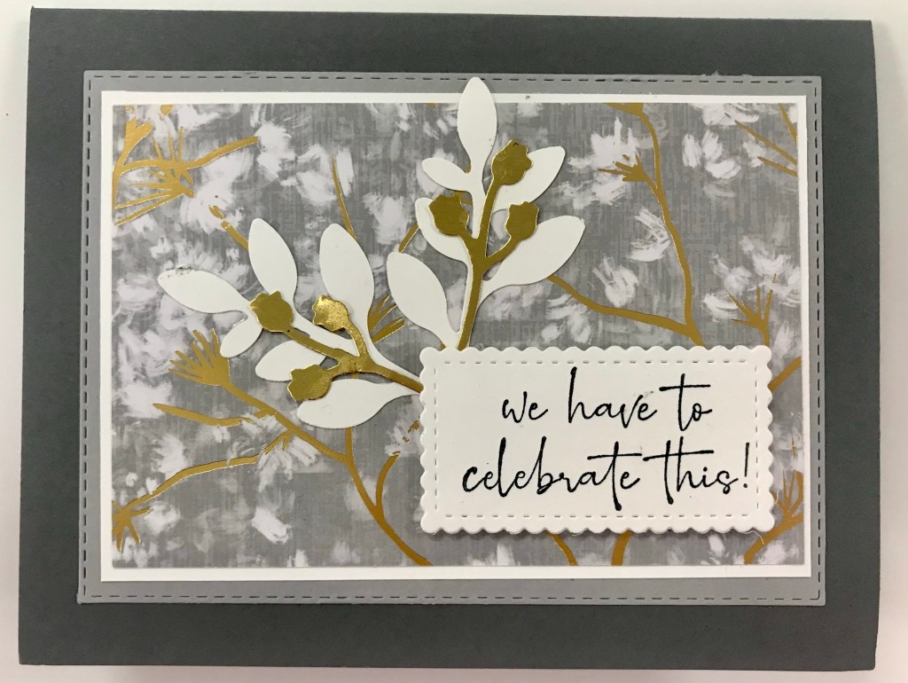 Finally, I cut out the boughs from Whisper White cardstock and Gold Foil paper to adhere behind the greeting!