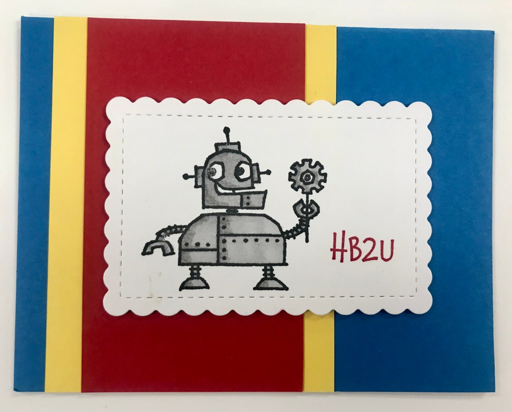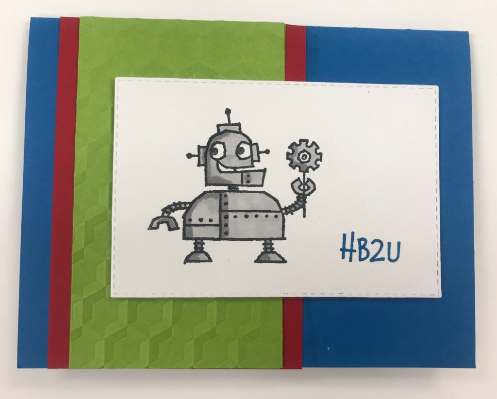 For this card, I stamped the robot in Black Momento Ink on Whisper White cardstock. I stamped the “HB2U” greeting in Real Red Ink next to the robot and used my light and dark Smoky Slate Stampin’ Blends to color him in.