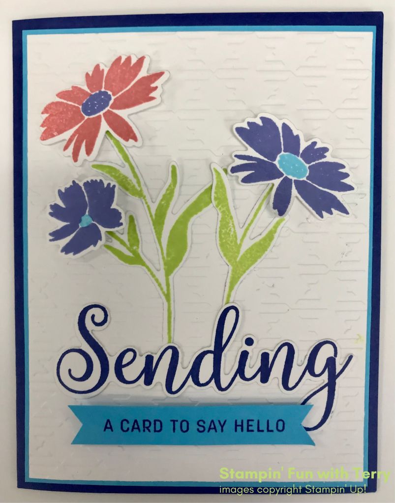 I stamped the flowers from the Sending Smiles Bundle on Whisper White Cardstock. I stamped the stems in Parakeet Party Ink and the flowers in Sweet Sorbet, Starry Sky, and Tahitian Tide Ink.
