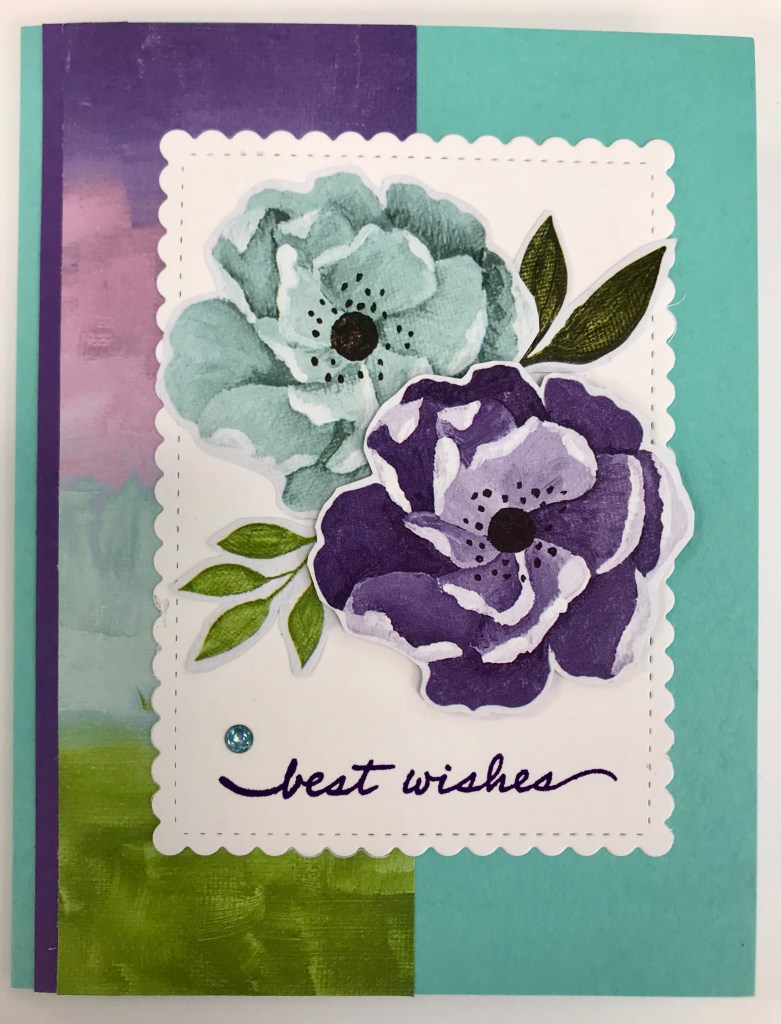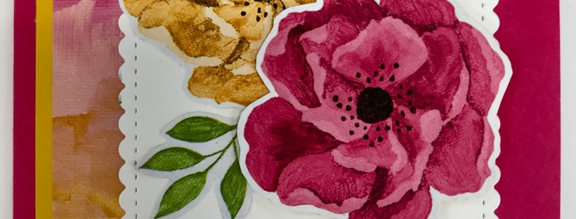 I cut the flowers from the Hues of Happiness DSP. You can use the die from the bundle to cut the corresponding flowers out. I adhered the front flower to the card with dimenstionals.