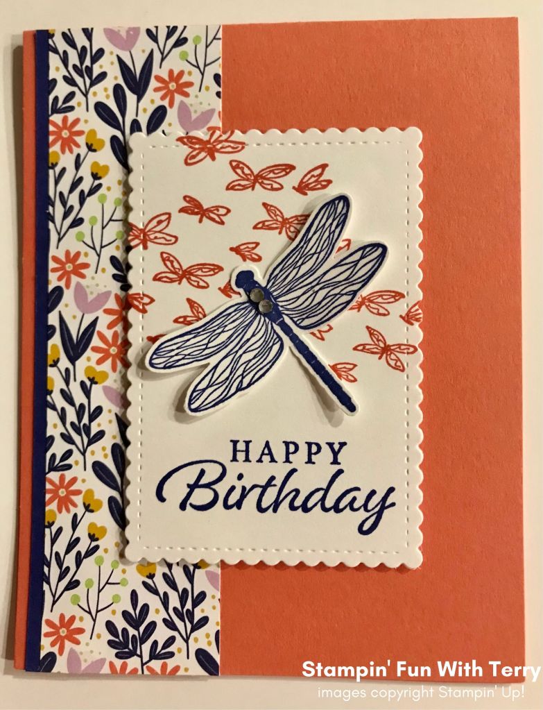 I stamped the “Happy Birthday” greeting in Starry Sky ink on Basic White cardstock. Above the greeting, I stamped a couple dragonfly clusters in Calypso Coral ink with the stamp in the Dragonfly Garden set. I cut out the greeting with the Scalloped Contour die so that the dragonflies were a bit cut off.