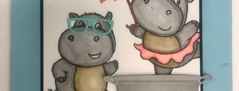 Create the image on a piece of Basic White Cardstock. Stamp the Hippest Hippos in Black Memento Ink. I used my Granny Apple Green Stampin’ Blends Markers to create grass. I used my Crumb Cake Stampin’ Blends Makers for the hippos’ bellies. I used the darker color for the outline to create some dimension. I used my Smoky Slate Stampin’ Blends Combo Pack for the hippos bodies and Flirty Flamingo Stampin’ Blends Combo Pack for the hippo’s mouth and the other hippo’s tutu.